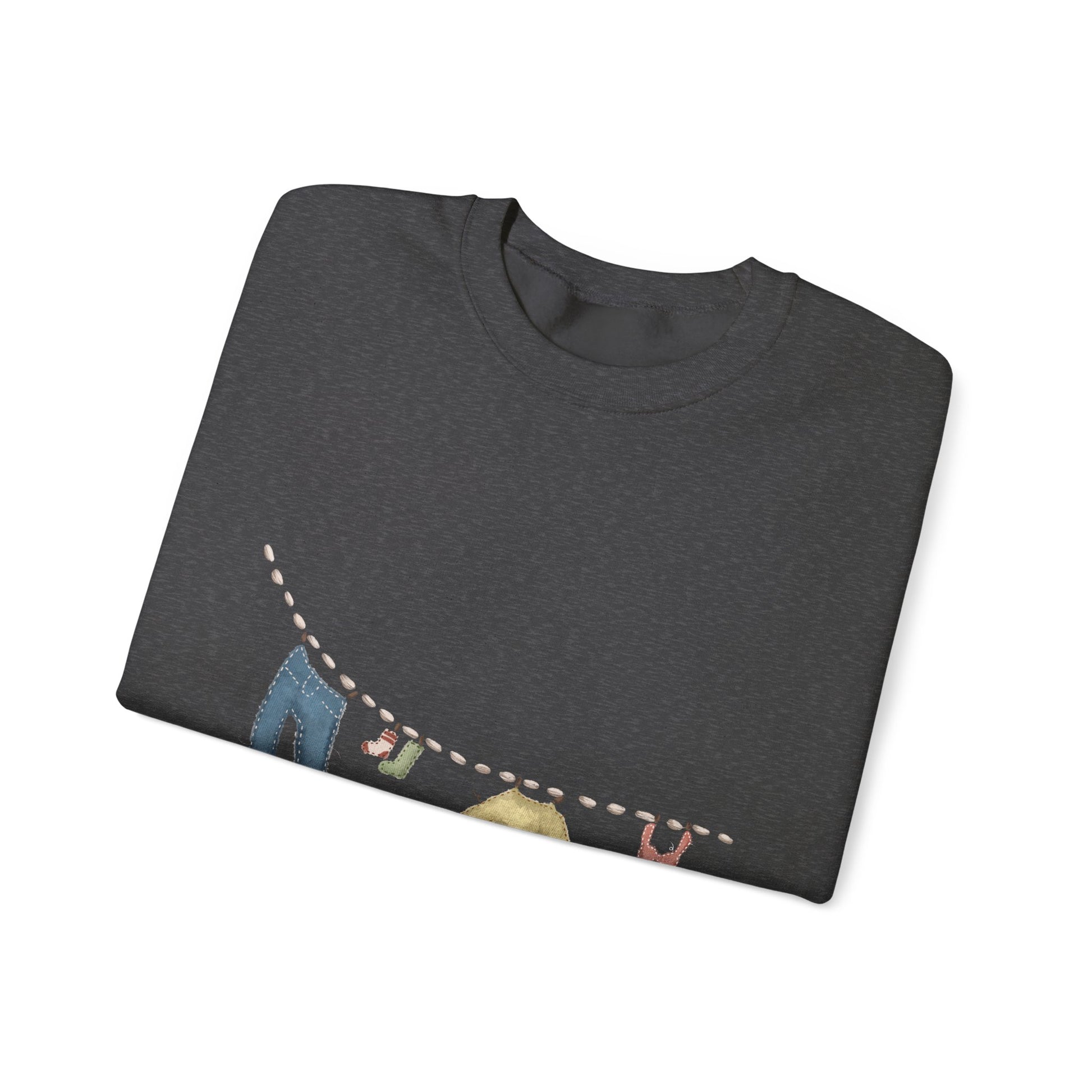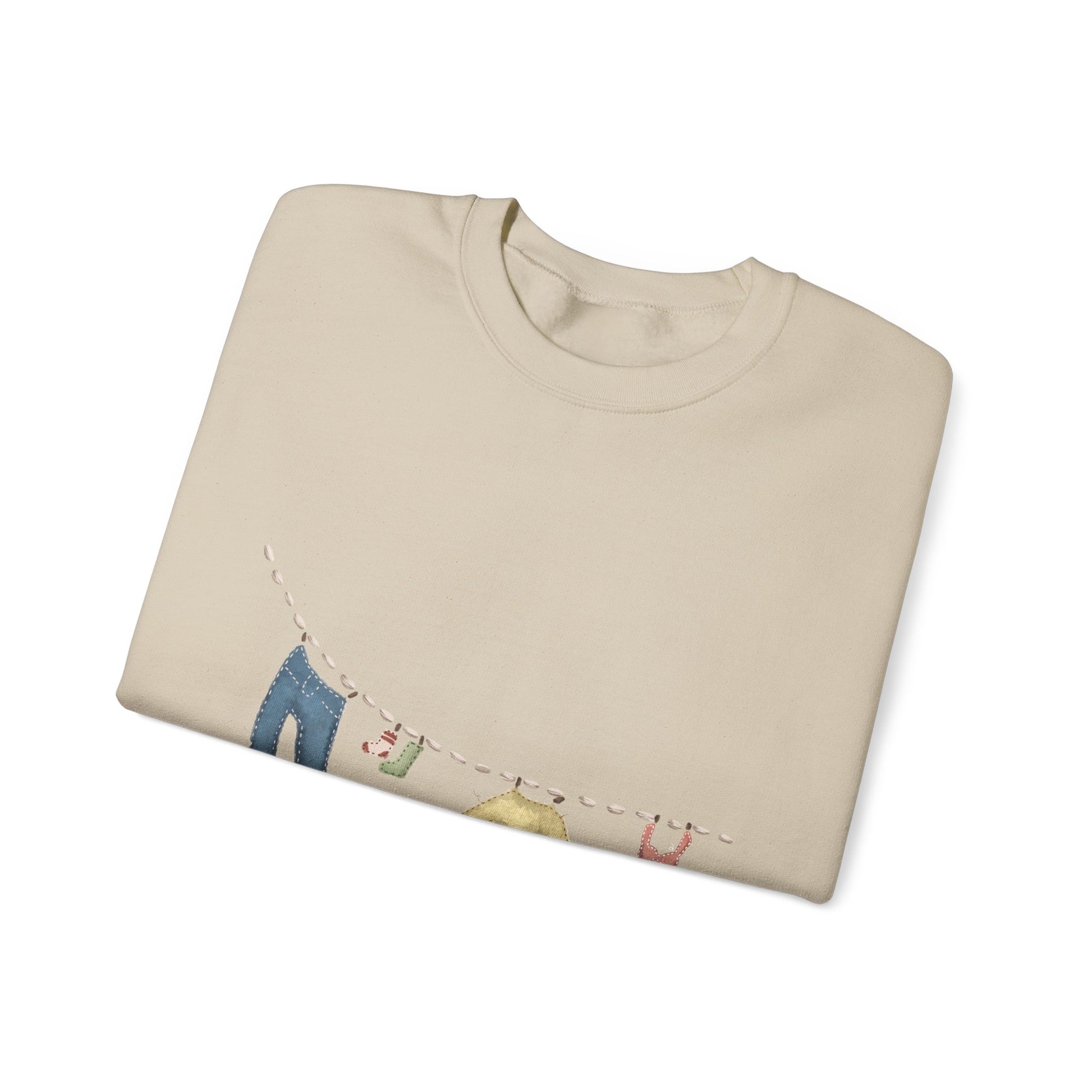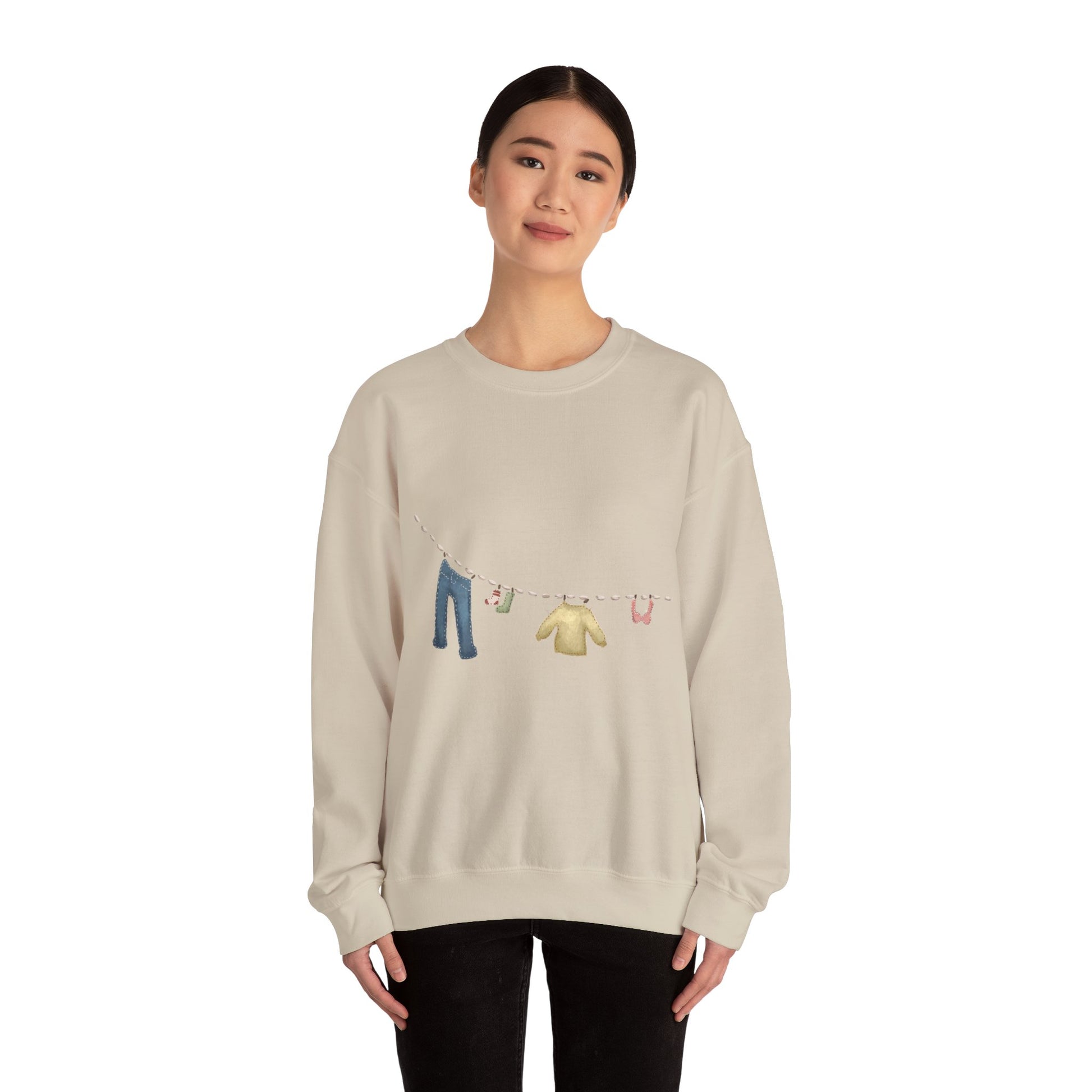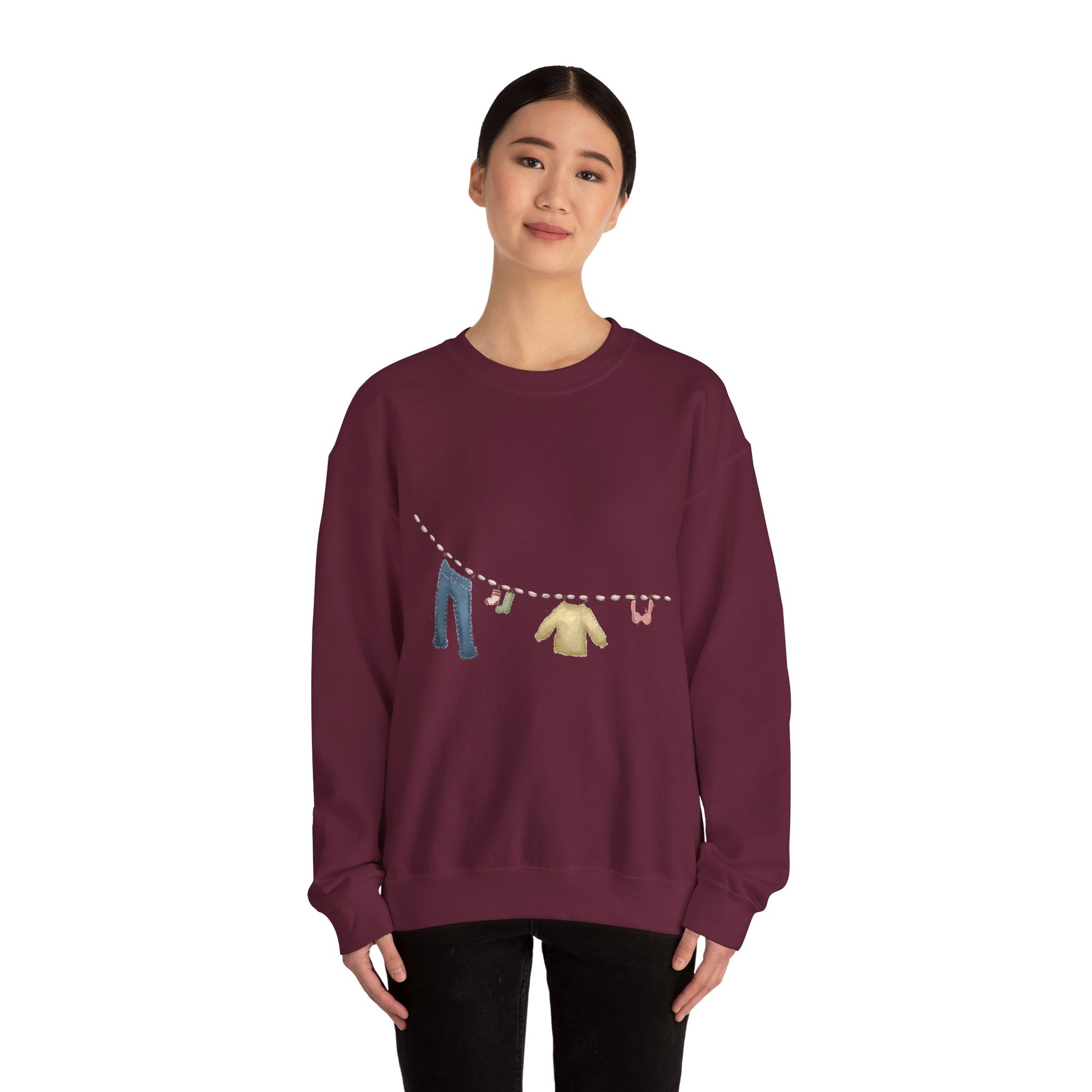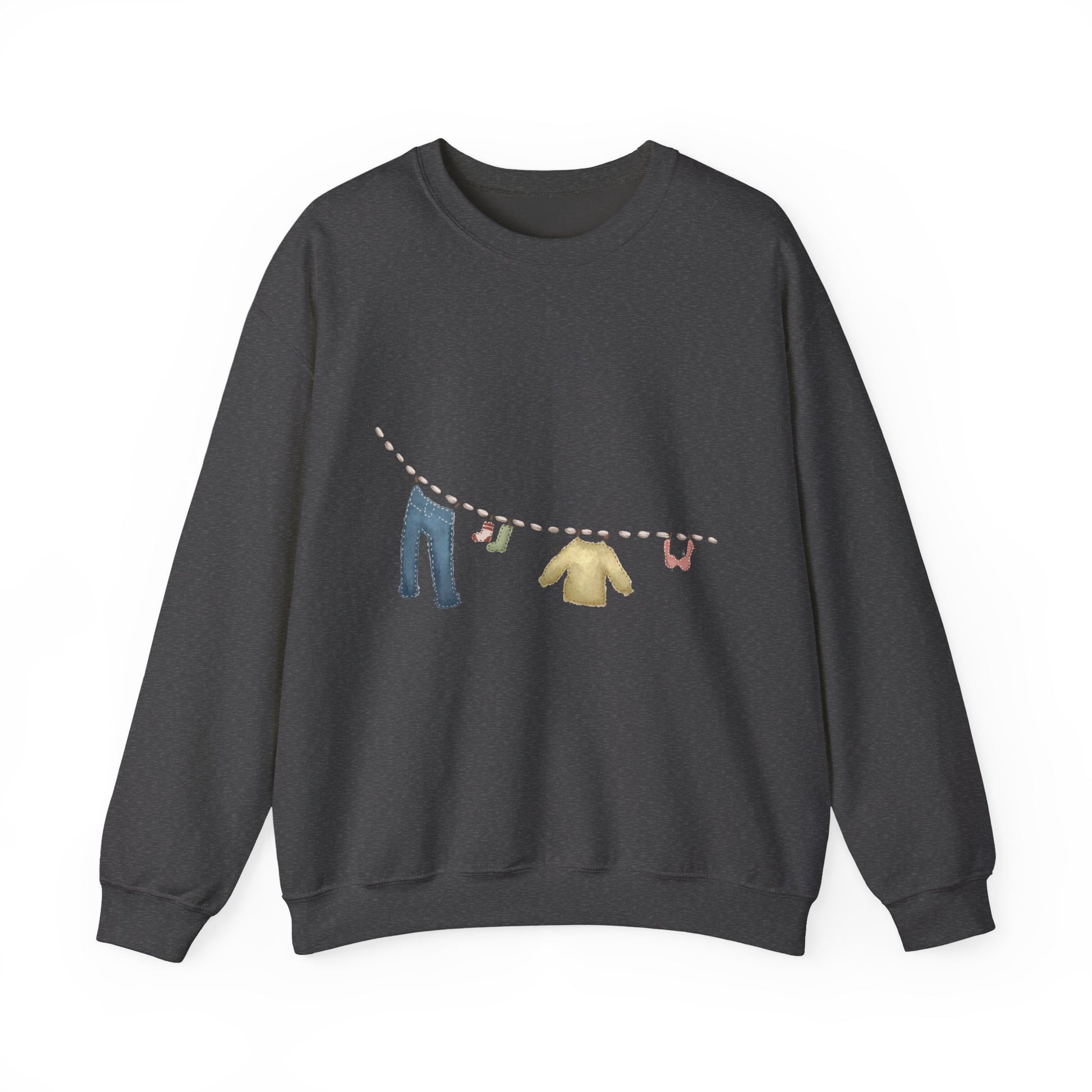 A cozy sweater with a drying clothing line design stitched patchwork-esque design. Perfect for the colder months, this heavy blend crewneck sweatshirt offers a classic fit and comfortable wearing experience. Ideal for adults looking for a durable and warm sweatshirt for everyday wear. Relevant for fall and winter seasons, as well as casual occasions.